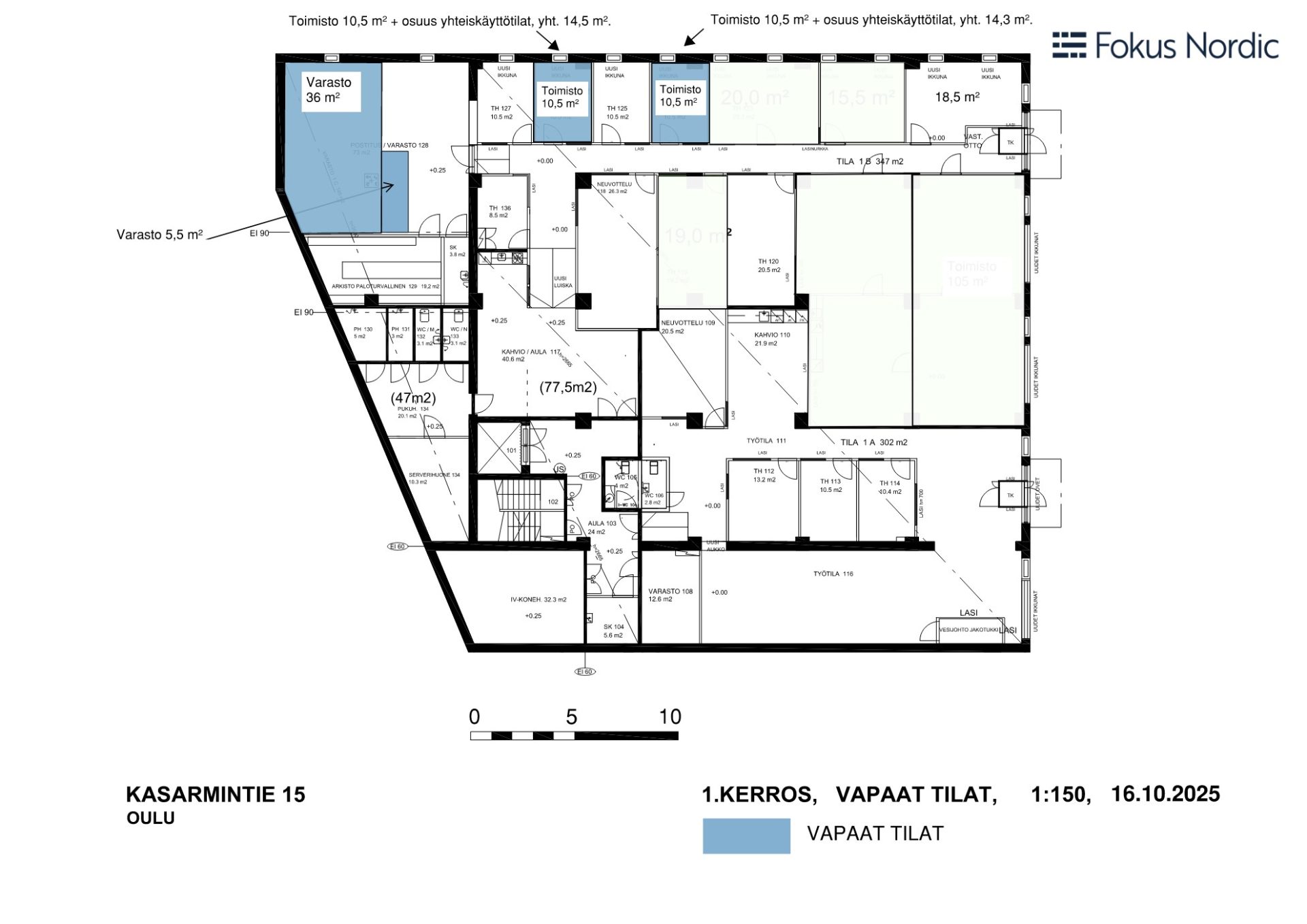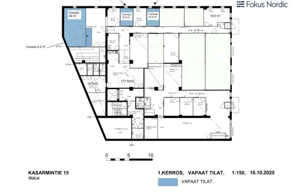 Tilat Vapaana: 2 kpl 10,5 m², 587,4 m² (jaettavissa 214,5 m²/372,9 m², vapautumassa: 219,5 m²