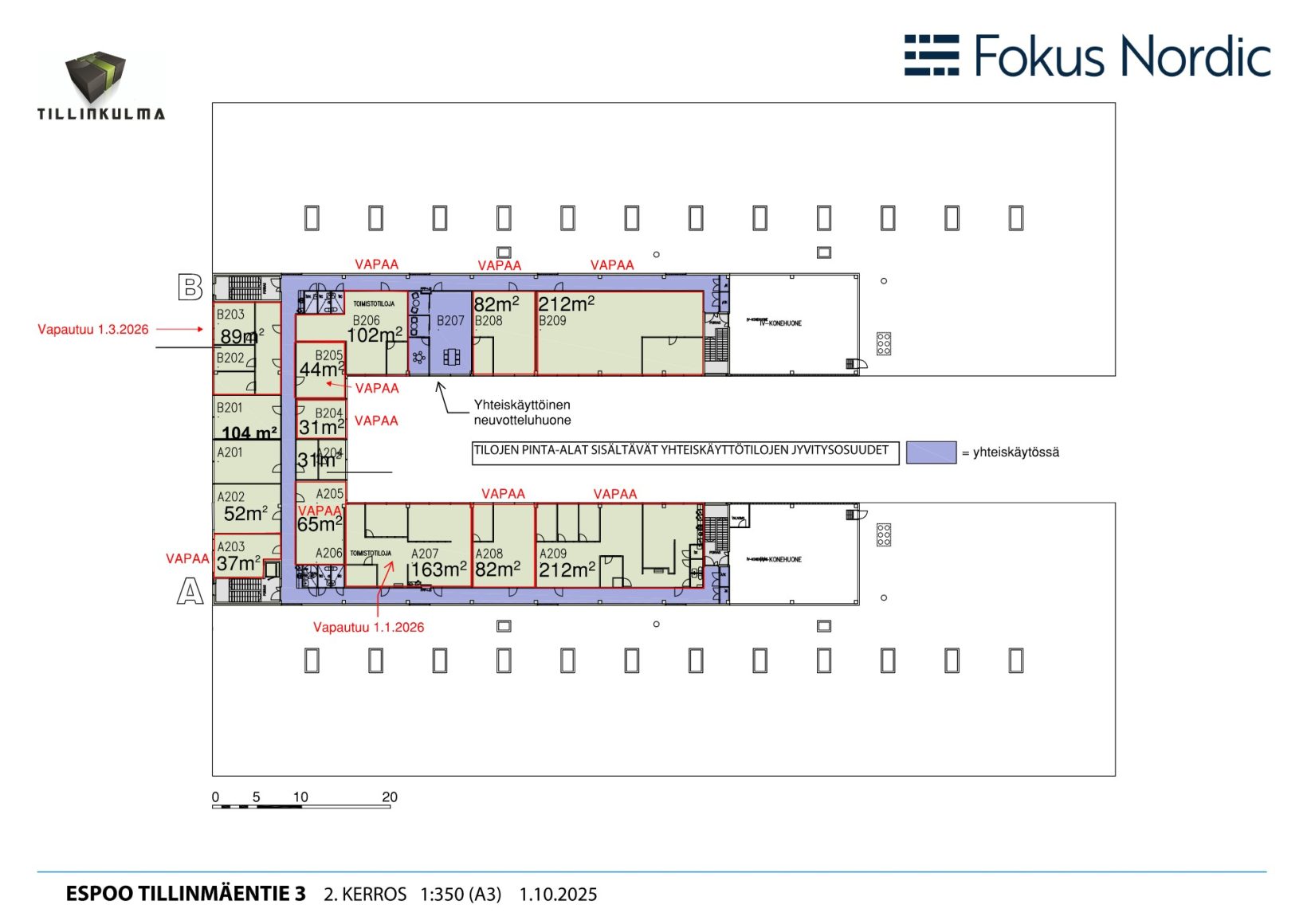 Toimistokerroksen kokonaispinta-ala on noin 1 200 m², ja tilat ovat jaettavissa 31–1 200 m² kokoisiin kokonaisuuksiin käyttäjän tarpeiden mukaan. Tilat A201 + B209 mahdollistavat sekä pienemmät toimistokokonaisuudet että koko kerroksen kattavan ratkaisun yhden käyttäjän käyttöön.